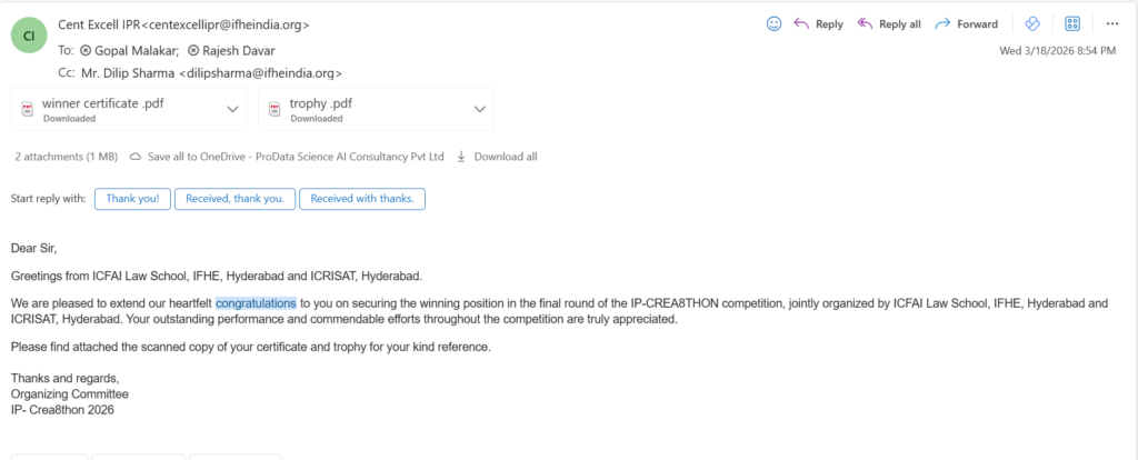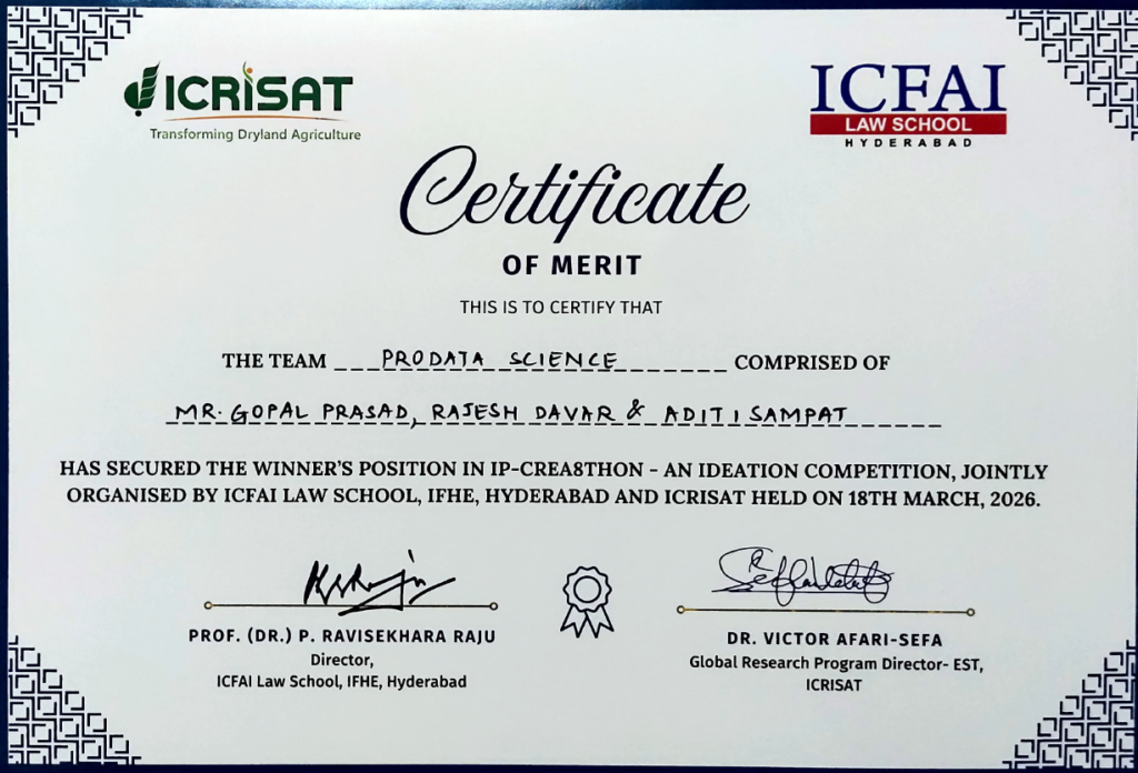 ProData Science Consultancy Pvt. Ltd. is proud to announce that Extreme-ML, our flagship AI-assisted machine learning platform, has secured π₯ First Prize at the prestigious IP-CREA8THON 2026 innovation challenge jointly organized by ICFAI Law School, IFHE and ICRISAT.